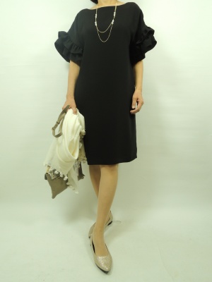 キレイ目のワンピース。 黒だと少しさみしい印象になりがち。 あえてボリュームを持ってきて華やかな印象に。 シックなネックレスと合わせて。 こういった袖にデザインのあるワンピースは なるべく羽織がない方が素敵ですが もし羽織るのであればストールなどが良いですね!