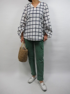 カジュアルな装いにカーゴパンツは ピッタリですね。 トップスの白地にネイビーの色合いに グリーンのパンツはよく合います。 雑貨を上手く取り入れて カジュアルにまとめてみました!