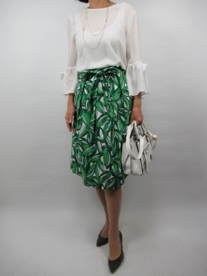 柄が流行のこの春にピッタリの一着。 特にトレンドカラーのグリーンをベースにした キレイ目スカートは 見ているだけで春を感じる。 トップスはシンプルにフェミニンスタイルを 合わせてみました。 きちんと清楚さを表現した一着です!