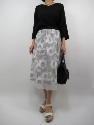 柄生地に白のオーガンジーの生地を 合わせたフェミニンタイプのスカート。 ベルトはゴムで黒を用いているので トップスを黒で合わせてみました。 上下のつながりができてワンピースの様に見えます!