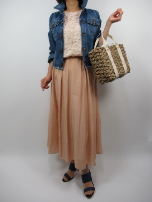 優しい色のピンクベージュを あえて上下とも同系色でまとめてみました。 淡い色合いの春にふさわしいコーデです。 流行のGジャンで引き締めました!