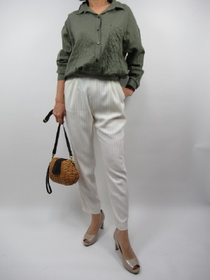 ベアトリスからカーキのシャツをご案内します。 襟部分と前身頃の前立て部分にワイヤーが入っていて シャツ事態はとろみがあるタイプですが ワイヤーが入ることによってメリハリのできたシルエットになります。 合わせたティーパードパンツはストライプで 縦のラインが綺麗に出てくれます。 白パンツですが柄が入っているので 透け感は気になりません!