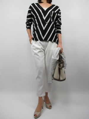 ゆったりデザインのカットソー。 斜めに入ったボーダーがシルエットを 細く見せてくれます。 V字ネックの首回りもすっきりした 大人っぽいデザインのカットソーです。 白のパンツでシックな装いにしてみました!