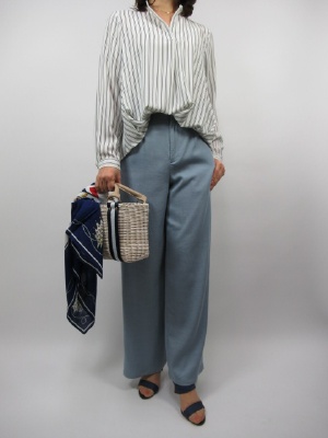 ストライプのブラウスにブルーのワイドなパンツを 組み合わせてみました。 ワイドですが広がりを抑えて スッキリ見えるシルエットです。 デイリーにはかごバッグで カジュアルなコーデにしてみました!