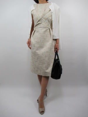 ベーシックなエレガントワンピースには カーディガンがしっくりと相性がよく バランスが取れますね。 ただ 裾を通さず肩乗せにしてみました。 全体にナチュラル系のトーンなので バッグにブラックを持ってきました!