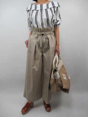 マリードール同士で上下合わせてみました。 ストライプ柄の丈長シャツブラウスは 細身のパンツでも安心して合わせれます。 今回みたいなワイドパンツでも 全体にインしたらとてもスッキリ見えます。 襟元は変形セーラカラーになっていますが 下着が見えるほど首回りも開いていないので安心です。 ウエストマークのワイドパンツはゴムになっていてリボンで調整できます!