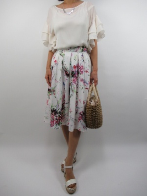 白地に綺麗な色をペイントしたプリント柄スカートは 春のこの季節に爽やかな一着です。 トップスも袖フリルでふんわりしたデザインをチョイスして 全体にソフトな柔らかさを表現しました。 小物はかごバックでより爽やかさを表現しました!