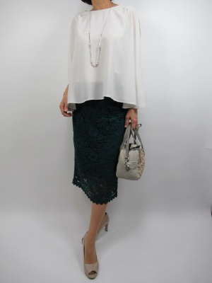 レースの透け感を活かした大人のエレガントコーデは センスアップにつながります。 トップスのふんわりシルエットが タイトをより引き立ててくれます。 ヒールのパンプスを履くと足元の バランスが取れてよりエレガントです!