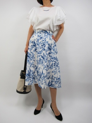 白を全面に押し出し その中にブルーの花柄がとても可愛く 清楚なイメージを作るコーディネート。 爽やかな季節と目の前にコーデにも 爽やかさをプラスして軽やかな お出かけファッションにしてみました!