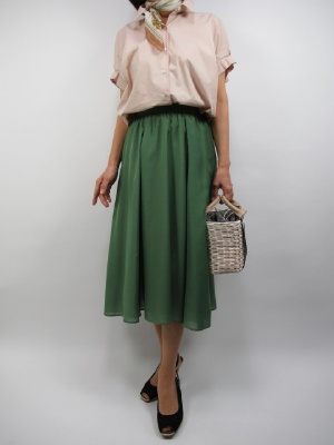 モスグリーンのシックな色には ピンクベージュがよく似合う。 コンパクトに詰まった襟ぐりが フェミニン度を高める。 プチスカーフを襟元にまくと 一層フェミニンな印象に・・・。 スカートのエアリー感が 一段とこのコーディネートをキュートに見せてくれます!
