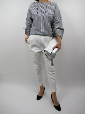 ティーパードパンツはウエストゴムで タック入りのとてもはきやすいパンツ。 サラッとしたストレッチのある生地なので動きやすいです。 トップスはストライプのオシャレブラウス。 特に袖ギャザーがボリューム袖を 横に広がらないように、うまくシルエットを作ってくれて 見た目もすっきりですね!