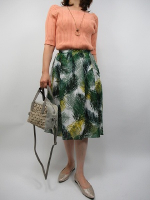 胸元の開きに注目。 スクエアカットで大きく開いたデザイン。 コンパクトなトップスにボリュームスカートでコーディネート。 ボタニカル柄のグリーンとオレンジの 相性がピッタリですね。 スカートはやや前後差のギャザースカートです!