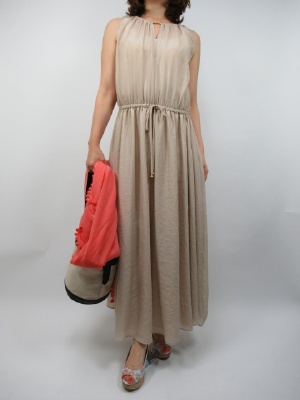 マキシ丈はスカートにもワンピースにも 今年は多く出てきています。 その中でふわっとした優しい素材と ナチュラルな糸のこちらのワンピースは とてもエレガントなシルエットで 大人の夏のワンピースです。 小物をオレンジなど明るい色をプラスして 華やかさを演出してみました!