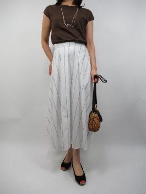 四枚ハギのフレアースカートは 白地に細いストライプ柄。 涼しげな夏にピッタリのスカート。 トップスを濃い茶系のニットで 引き締めてみました。 コットン100%のとても気持ちの良い素材 手洗いできるのは夏に嬉しい一枚ですね!