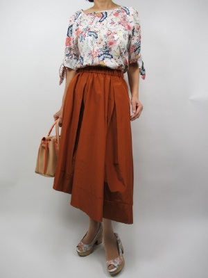 フィグノの新作スカートはイレギュラーと前後差の 2WAYで作られたスカートです。 同じスカートでも印象が違って見えると オシャレを2倍楽しめますね。 お色はオレンジとライトブランの2色。 今回はブラウスが明るめのお色だったので スカートの色は少し落ち着いた感じに。 ブラウスはお袖にさりげなくリボンがあるので 可愛らしさも表現してくれます!