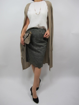 こちらのスカートはID95018のブラウスとセットアップになります。 今回はスカートを他のブラウスでコーディネート。 シンプルな麻混のブラウスでシンプルに合わせました。 羽織るカーデはロングでリブ編みなのでタイトにすっきり!