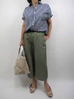 お袖にタックが入ったタイプのシャツ。 ハルズアミの人気の商品になります。 無地もありますが今回はギンガムチェックでデイリーに合わせました。 ブルーのチェックなので少し柔らかい雰囲気になりますね。 パンツは麻混のワイドパンツを合わせました。 カーキとネイビーで爽やかな色合いで。 パンツはワイドですが柔らかい素材なので 広がり過ぎず、着やすいと思います!