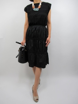 黒は夏にこそ映える。 どうしても暗いイメージですが 夏の黒はオシャレに着こなしてこそ 引き立つ一枚。 カットワークレースをところどころ入れたワンピース。 ウエストマークでキレイ目シルエット。 かごバックやサンダルで夏の演出を!
