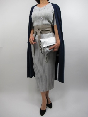 シルバーラメ系を使ったワイドリブニット。 そのセットアップは大人っぽいスレンダーな一着です。 大きく開いたV字のネックに膝下のタイトスカート。 ポイントは流行のサッシュベルトで メリハリをつけること。 さらに着流しカーデを肩にかけると より一層オシャレ度が増します。 お出かけコーデになります!