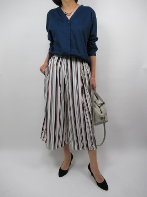 ノーカラーのV字ネックシャツは ゆるっとしたデザインなので 着る時にざっくりと無造作に着るのがオシャレ。 抜け感のでる首回りが女っぷりを上げてくれる。 ボトムスにメリハリの効いたストライプを 持ってくるとまとまりのあるシルエットが完成する!
