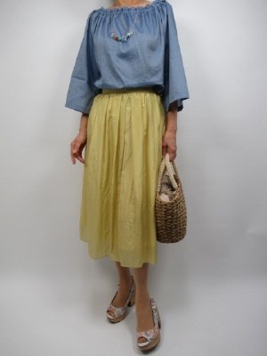 ブルーとイエローの優しい色合いで合わせました。 今年は前後差の丈長スカートが多く出回っていますが そう言ったデザインが苦手な方必見。 膝は隠れるくらいの長さですが、前後差のないふんわりスカートは カワイイコーディネートにピッタリです。 薄目のイエローですが裏地もついているので 透ける心配もありません。 合わせたブルーのブラウスはオフショルダータイプですが 2WAYなので、そこまで肩を出したくない方も キレイに着て頂けます。 袖が少しベルスリーブになっているがポイントですね!