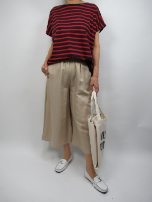 ネイビーとレッドの配色のカットソーは赤色がワンポイントになるので ボトムスを薄目の色で合わせても締まりますね。 今回はシンプルなベージュのワイドパンツで合わせました。 チノパンのような生地感で、カジュアルにとても合わせやすいです。 形がとてもキレイなのでカジュアルになりすぎず かっとそーで合わせてもとてもキレイに見えます。 ちょっとしたお出かけにカッコよく決まればより楽しくなりますね!