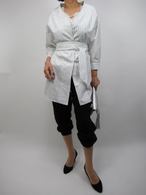 ブルーベルのノーカラーロングシャツはシャツとして着るより 羽織りとして着て頂く方がよりオシャレでカッコよく着こなせます。 ボタンを留めてサッシュベルトのような共ベルトを腰に結びます。 パンツは少したくし上げて着崩した方がバランスが取れて オシャレにカッコよく着こなせます!