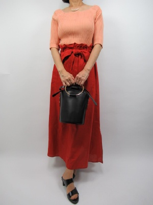 マキシのスカートはエレガントなスリット入り。 ウエストゴムにサッシュベルトでポイントをつけます。 トップスにはスカートの色のぐれでーションで 薄い淡いオレンジ系のニットを合わせtました。 オフショルタイプのコンパクトなニットが スカートの丈の重さを緩和させてくれます!