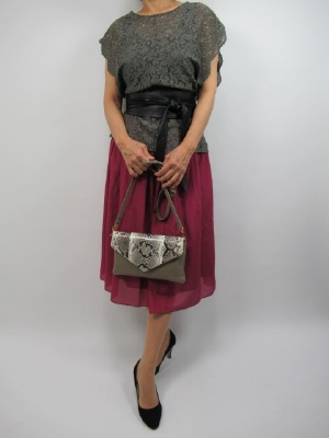 カーキのレースブラウンをパープルのスカートで合わせる。 ギャザースカートはインにして着こなすと甘くフェミニン度が増しますが オーバーブラウスにすると大人っぽっく上品に仕上がります。 メリハリをつけるためにサッシュベルトを上手に活用してエレガンススタイルにしてみました!