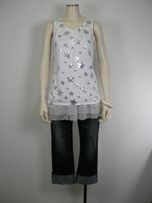スパンコールの花柄がポップなタンクトップに裾ティアードのキャミソールを重ねました。ボーイッシュ7:ガーリー3の着こなし!アクティブ度100%。