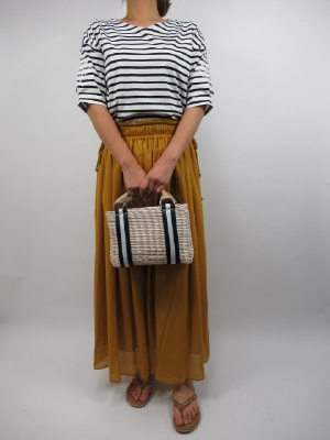 マキシ丈のギャザースカートはふんわりボリューム感は出ますが 広がりすぎず歩くたびに揺れ動く感がとても素敵です。 特徴としてはウエストの両サイドにまるリボンです。 2段でリボンになってウエスト部分を調節できます。 シンプルにボーダーのカットソーで合わせました。 カットソーはお袖部分が刺繍になっていてとても可愛いです。 夏らしくトングのサンダルで合わせました!