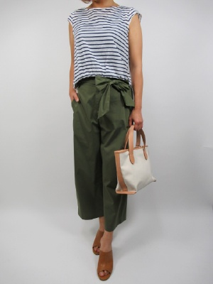 ベアトリスで上下を合わせてコーディネート。 一見シンプルなボーダーのブラウスに見えがちでが 後ろから見るとレースの切り替えになっていrます。 レース部分はインナーが透けて見えるのでお色を 替えると雰囲気が変わりますね。 リボンパンツンも合わせてコーディネート。 前を少しはさむとリボンも引き立ち、足長効果もございます。 後ろは可愛いレース部分を出してポイントに!