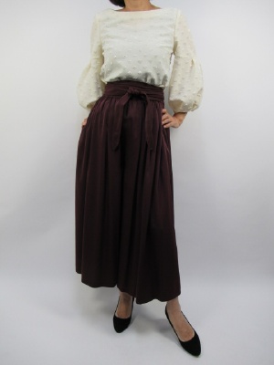 ヌークのフロッキー生地がとても好印象なブラウス。 ホワイトとキャメルの2色展開です。 袖の切り替えから袖口にかけてボリュームが出ていて 女性らしいシルエットになっています。 パープルのパンツと合わせてみました。 スカートの様に見えるパンツは揺れ動く感じが とても素敵で共布のベルトが付いているので 今年らしい雰囲気になりますね!
