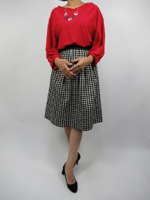 色鮮やかな赤を上品に大人っぽく着るには 黒が一番引き立つ。 タックのふんわりスカートは、少し甘めのシルエットだが 黒とシルバーラメの配色で品よく仕上がっているので 子供っぽくならず、大人の赤×黒のスタイリングで まとめることができる。 友達とランチスタイルに秋の新作でオシャレを!