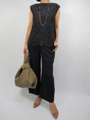 まだまだ暑いこの時期ですが 気分は秋を先取りしたい。 ノースリーブで流行のレースはシックな秋色を取り入れて。 同色のパンツで落ち着いた感を出して・・・。 サッシュベルトも同色だと浮くこともなく それでいてウエストを絞れるのでスタイルよく見せてくれます!
