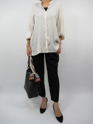 ノーカラーのとろみのあるブラウスは長い時期、着て頂ける一着です。 お袖がかなりボリュームがあるので袖はたくし上げるとバランスがとりやすいですね。 トップスにボリュームがあるのでボトルすは少しテーパードパンツで ボリュームを抑えて、両方ともとろみのある生地で合わせました!