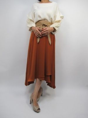 お袖がとても印象的でオシャレなブラウスをご紹介します。 フリルとその下がボリューム袖になったタイプのブラウスで お色が他にマスタードと黒の3色展開です。 着丈は少し短めでワイドパンツなどにも合わせやすいタイプです。 今回はアッシュローブのイレギュラータイプのスカートと合わせ サッシュベルトでメリハリをつけてコーデしました。 スカートはラップ風になっていますので、中が見える心配はありません。 揺れ動くシルエットがとても素敵です!