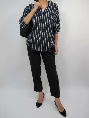 ガレアのとろみのあるブラウスはネイビーに白地のストライプが入っていて 一枚でメリハリのある印象に。合わせた黒のドロストパンツは ややテーパードになっているのでちょうどブラウスとのバランスがとてれ 足元がスッキリ見えます。ブラウスは前後差があるので ヒップラインも隠れてくれて、とろみもあるので安心ですね。 スタッズ月のバッグと合わせました!