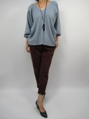 毎年人気のパシオーネのカジュアルパンツ。 今期も新しい色で入荷してきました。デザインが変わって ウエストの後ろ部分にゴムが入ったデザインです。 色もボルドーがおすすめです。ややロールアップになっているので ヒールにも合いますがスニーカーなどもとても合います。 ブラーミンのニットはざっくりしていてお袖もボリュームがあるので 細身のパンツを合わせてスッキリ見せました!