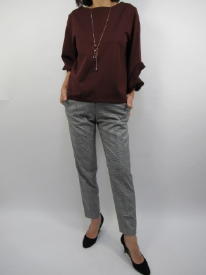 ブルーベルの新作アイテム、ボルドーのブラウスは お袖の部分がフリルをあしらったデザインでお袖にゴムが入っています。 少したくし上げて着るとフリル部分が強調されて ファッションを楽しめます。 今季人気のグレンチェックのパンツと合わせた やや緩めのシルエットなので ヒールと合わせるとバランスがとりやすいです!