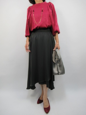 新学期が始まりママたちも一段落。 秋一番のランチコーデはイレギュラーヘムスカートで流行をチョイス。 トップスには華やかな赤色と組み合わせて テーブルについた時 顔回りの印象がとてもよくなります!