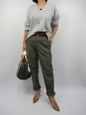 このべイカーパンツはややゆったり目のはくのが正解です。 程よいゆるさが今年っぽいですね。 ロールアップしてヒールで合わせると女っぽさが増すコーデになります。 トップスもゆるニットをザックリ無造作に 着こなすのがポイントです!