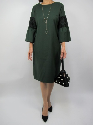 袖のレースが印象的なサックワンピース。 秋の流行色の深いグリーン色です。 シックな色ですがレースがあるだけでも オシャレでエレガントな一枚です。 きちんとしたお出かけにピッタリな一着。 アクセサリーはシンプルにしてワンピースを引き立たせて!
