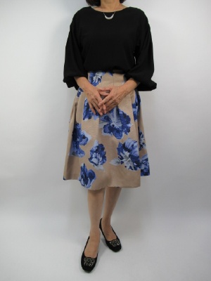 グログランのハリのある生地に大きな花のプリント柄が 印象的なプリーツスカート。 ふんわり感がありコンサバ好きな人にはたまらない一枚。 トップスのブラウスは袖口がゴムなので 自分好みなところでたくし上げ ボリュームをつけることができます。 黒も用いてフェミニンな中にシックな印象をつけて!