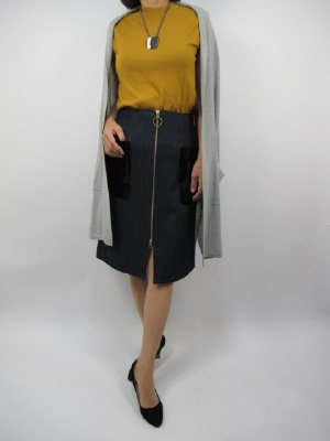 タイトのスカートでもデニム地になると ちょっとカジュアルなイメージ。 でも子のスカートはファー使いの少しフェミニン度のあるスカートです。 ニットとシンプルに着流しカーデを羽織って オシャレなコーデに仕上げました!
