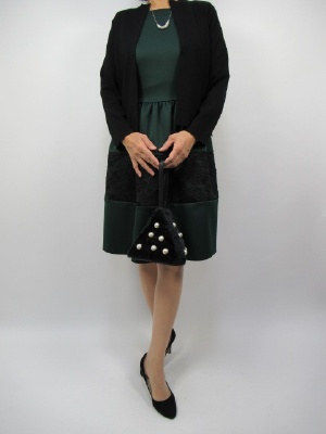 きちんと感を印象付けるために ワンピースハとても便利な一着。 深いグリーンと黒の配色が秋を感じさせます。 ボレロはニットですがしっかりした編地ですので ワンピースに合わせてもカジュアルにならず エレガントな装いになります!