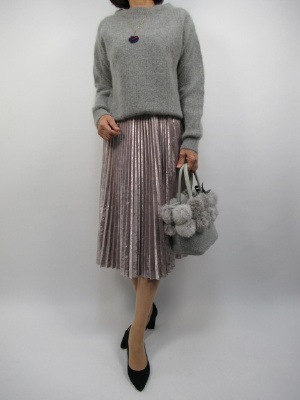 べロア調の生地のプリーツスカートを 軽やかにしてくれるのはフワフワニット。 羊毛入りの肌に優しい素材なので 素肌にもチクチクしない。 グレー系と淡いピンク系のロマンチックな 色合いが女らしい。 ニットの季節到来でオシャレを楽しみたい一着!