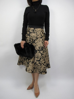 黒のタートルをフレヤースカートでシンプルにまとめました。 スカートはハリのある生地ですので ふんわり感がとてもオシャレ。 黒字に花柄が全体の黒を明るく華やかな印象にしてくれます。 大人っぽくエレガントな装いに タートルの黒を活かしたオシャレコーディネート!
