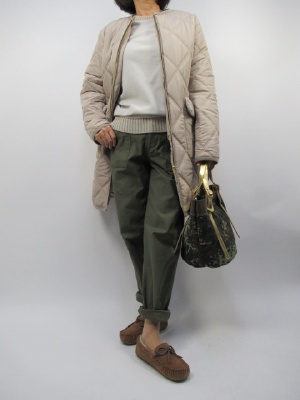楽ちんなゆるシルエットのベーカーパンツは カジュアルな一枚です。 今回はアウターにキルティングのコートをプラスして デイリーなコーデにしました。 バッグも迷彩柄のトートバッグでカーキのパンツに 合わせたラフコーデです!