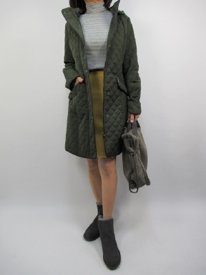 パシオーネのカジュアルなコートはキルティングですが とてもスッキリボリュームを抑えて 特にウエスト部分が絞ってあるのが特徴です。 生地の厚みもすくないので着ぶくれ感もなく 着こなせるコートです。 丈も短いのでやや背の小柄の方にお勧めした一着です!